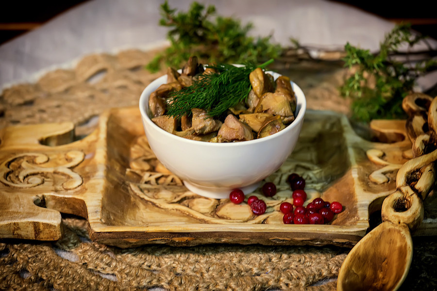 Difficult to imagine Karelian cuisine without mushrooms. Various sorts of local mushrooms are not only salted, marinated, and dried, but used in soups and second courses, sauces and porridges as well. The turnip has always been the king of vegetables in the Karelian cuisine. Sometimes called "our second bread", it was used in large quantities as steamed, dried, boiled and raw. Other popular vegetables in Karelia are radish, onions, rutabaga, cabbage, zucchini and peas. They are part of many national Karelian dishes.